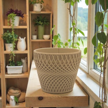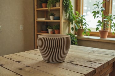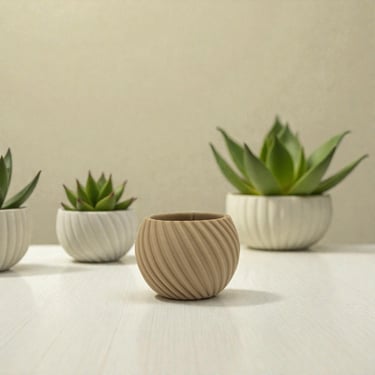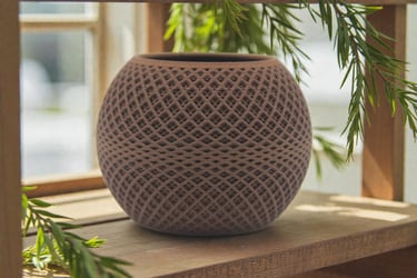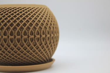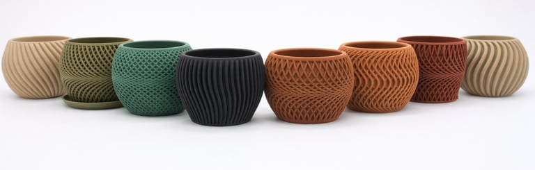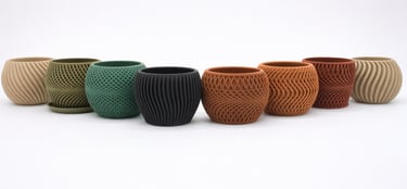 Discover our collection of 3D-printed wooden flower pots. Each piece is crafted using advanced 3D printing techniques and made from a unique composite containing up to 40% recycled sawdust..